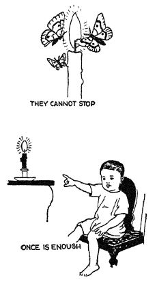 Take the moth, for example. The moment a moth emerges from its pupa stage, it has all of the abilities of a grown moth. It does not have to be told where and how to get its food; where and how to get shelter; where and how to lay its eggs and provide for its young. It does ah things by instinct. It can become a thoroughly capable moth without ever seeing or learning from any other moth. But there is another [ p. 305 ] side to the story. While it is “bom” with all the abilities of a grown moth, it is rigid. It cannot learn. For example, when it sees a candle flame, it flies into that flame. It gets scorched, and flies out. But it does not learn to avoid the flame. If it sees the flame again, in it goes, and that continues until either the flame is taken away or the moth is killed. It cannot learn. It has almost no ability to change. [1]