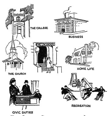 Social organization. — Part IV deals with man, the teamworker, the cooperator, the member of an organized society. Evidently, when we study Part IV, we are to see that man finds still another multiplier of his powers through cooperating with others in a group or society. That being true, we should expect our schools to give us the social studies (history, civics, economics, and sociology) so that we can learn how society is put together and how its work is done. We should expect to find our schools telling of our country, of what it means to be a good citizen, of some of the problems our country faces, of what we are doing about those problems, of the joy and worth-whileness of serving society. Do you find such things being done in your schools? Are any social studies taught? Do you hear of our national heroes? Are patriotic exercises held? Do you learn of the duties of the officials of the city government and how to help them? Do you see how sensible such work is?