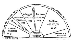 There have been hundreds of different kinds of religions in the past. There still are many kinds; but as time has gone on, four religions have been accepted by such a large proportion of the world’s people, that they are called the four great religions. They are (1) Hinduism and Brahmanism, whose followers are mainly in India; (2) Buddhism, whose followers are mainly in Japan, China, Burma, and Ceylon, (3) Mohammedan ism, whose followers are mainly in Asia and Africa; and (4) Christianity, with followers mainly in Europe, America, and Australia, although they are scattered all over the world.