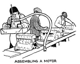 The main framework of the chassis is started on a moving platform. As it moves along, one worker drops a part into place; the next inserts a bolt; the next screws up the nut of the bolt; and so on. At the proper point of the trip, the engine (which has been put together along a route of its own) is dropped into place; so are the wheels, the body, — everything. Finally out the door it goes under its own power, followed by another and another and another every few seconds. The whole complex task has been done, but only a few workers have done complex things requiring much time to learn. Furthermore, workers have been assigned to jobs according to their talents.