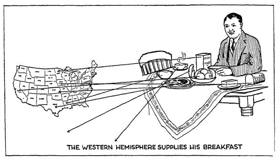 The wholesale grocer also works at the knitting together process. — The part played by the wholesale grocer is another important piece of service. He deals in commodities of a less perishable nature. He also, like the produce merchant, has his buyers out in the producing regions, even in those of far-distant countries. He imports tea from Japan and China; coffee from Brazil, Colombia, Java, and Arabia; cane sugar from the West Indies and from Hawaii; oHves from Spain and Italy. The fig trees of Turkey, the terraced rice fields of China, and the date palms of Persia supplement the food products gathered from the farms, orchards, pastures, and streams of our own country.