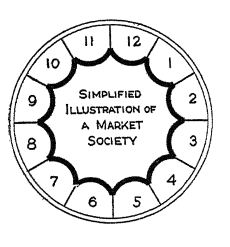 A simple illustration shows the work of the market. — The way the specialists of our cities are knitted together with those of the rest of the world is typical of the "way it is done tliroughout our society. This may be shown by a simple illustration. If our society were a small group of twelve, and if there were only a dozen goods and services in the world, we could easily picture the situation to our minds. It would be as if there were a dozen booths in which the goods and services were made, opening out into a market place. On the counter running around in front of the booths the goods could be displayed. Each of the specialists would sell his own wares and with the money he would buy such other wares as [ p. 386 ] he chose. The twelve, working as speciallsts, could make far more than they could have made as jacks-of-all-twelvetrades. They would cooperate with one another (be knitted together) through exchange.