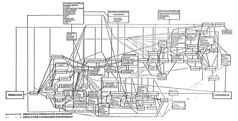 We have come to call these persons who work in “the market” for us middlemen. In the old days, when each person [ p. 387 ] [ p. 388 ] made or raised practically all the things he used, there were, of course, no middlemen. The producer was also the consumer; they were one and the same person. That state of affairs may be illustrated by this diagram: In the old days Producer = Consumer