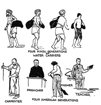 3. The caste system of India has become so rigid through custom, race prejudice, and religious prejudice that there is a terrible hopelessness about the system. The low-caste cannot rise: it is thought wrong even to wish to rise. It is believed that the gods have put him where he is, that they will be angry if he even thinks of escaping. This keeps the individual from striving to improve his condition, and there is little chance for progress without that striving. The caste system, in other words, checks the individual from taking the leadership or initiative. It keeps the individual, and especially the low-caste man, from being active and aggressive. It must be said, however, that the system does not absolutely prevent change. Indeed, changes are occurring at this very time.