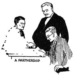 The change of an individual firm into a partnership. — After he had been in business two years he decided that he ought to take in a partner. His reasons were that (1) the business was so successful that money was needed for buying more machinery, and (2) he needed some one to take care of the buying and selling, so that he could give more time to the shop. A salesman of another printing house was persuaded to be the new partner. The two men consulted a lawyer, who drew up a simple partnership agreement, or contract. This stated what each put into the business, and how profits would be dixTided (see page 404) .