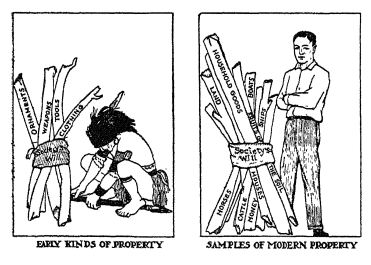Private property gradually came to cover many things. — No one knows the exact steps by which man came to have private property. Our first clear view of it is in the custom of the primitive warrior and primitive woman having the “exclusive right” to their own weapons, tools, clothing, and ornaments. Such things came to “belong” to one “private person” and not to the whole group, or to any other person. That is about as far as such exclusive rights extended among primitive peoples. It was so in the case of the Iroquois, you will remember (see page 63).