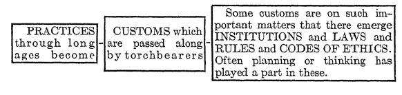 Custom did secure some group cooperation — but it also hindered progress. — There were both good and bad features about this cake of custom. Its best feature was that it did hold the group together and did set ways of doing things. We must remember that schools, churches, trading, government, laws, etc., as we know them, did not exist in those days. Those early peoples had only custom. Custom set what was to be [ p. 426 ] done and how to do it. It gave rules of the game for the cooperation of the group. To be sure, to-day we know that many of those rules were poor ones. But it was worth while to get started at having rules. It was a step in progress.