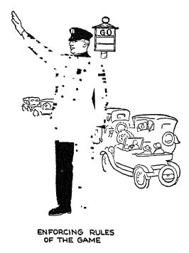 Then came the strange part of the dream. A sudden madness fell upon that street. The persons in the street, including the policemen, forgot all the “rules of the game.” They forgot that it was the custom to keep to the right; they forgot all the traffic laws of the city about parking, about who had right of way at crossings, about how to pass a street car, about the kind of signals to make — everything. In a twinkling of an eye, that comer saw a wild, cursing, fighting [ p. 423 ] mob scrambling over the wreckage of dozens of automobiles and street cars. Orderly progress had ceased.