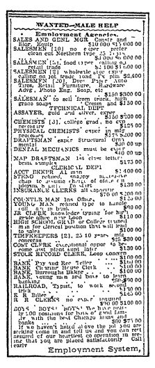 Out in industry, firms advertise for help at the factory gate and in the newspapers. The United States Government and some states and cities run free employment exchanges that bring worker and job together. Private persons also run employment exchanges. For a fee they find workers for employers and employers for workers. There are other institutions that merely spread information concerning occupations. Several private bureaus publish reports telling of opportunities in various work.