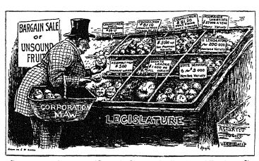 It is not merely in the business world that we have failed to make the best use of the gain spirit. We have failed also in other parts of our living. Greedy politicians have paid large sums of public money to themselves and to their grafting friends for little or no service. Some judges and police officers have taken bribes and given “protection” to vice and criminals. Some aldermen have taken bribes to vote for awarding fat contracts in street paving to the briber. Senators and representatives have sometimes voted to expend public money in ways that would give gains to them or to their bribers. The handhng of our governmental affairs by our representatives ought to be clean. Too often it has been and is filthy.