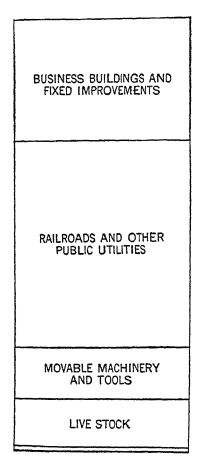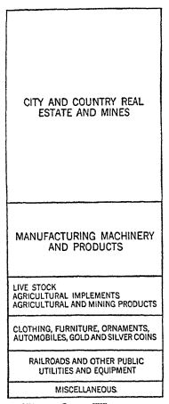 The diagram shows what is contained in this wealth of ours. Half of it is real estate and mines. The other half is made up of railroads, waterworks, telephone and telegraph equipment, live stock, machinery, manufactured goods, agricultural [ p. 177 ] commodities, clothing, furniture, precious metals, etc. One writer calls our wealth “the materials of civilization.”