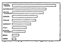 The surplus of good things is neither great nor rapidly growing. — Our wealth. — As far as the good things of life are concerned, we are the most fortunate people in the world, for, on the average, we have more wealth than the people of any other nation. When measured in dollars the total seems very large. In 1919 it was $294,145,000,000, a sum so large that the figures mean nothing to us. If, however, we divide this enormous total by the number of people there were in the United States in 1919, we find that the result does not look so impressive. It gives us an average wealth (we call this per capita wealth) of only $2750. This $2750 does not represent what we get each year; it represents all we have.[1]