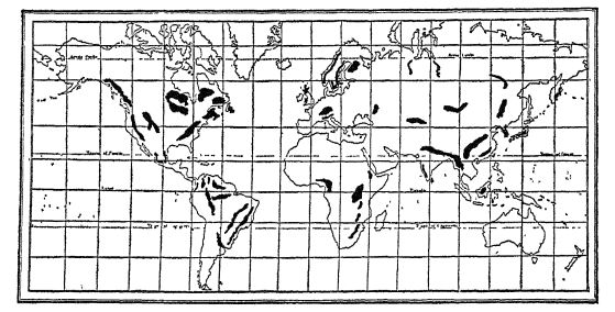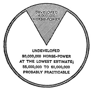 It must be remembered, however, that water power can not be developed everywhere. We can have good water power only in those regions where there is good snowfall or rainfall; where the flow of water is regular or can be made regular by making reservoirs; where the height above sea level is sufficiently great to get a “fall” as the water returns to the seas; where the surface conditions (topography) are such as to concentrate this fall at one point or at a few points, so as to be of service. The map shows that these [ p. 186 ] areas are neither very numerous nor very large, and some of them, as the world’s population is distributed to-day, are located at points which cannot serve many people. A shifting to winter power will probably mean considerable shifting of population also.