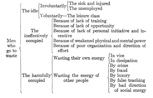 And then, as the diagram shows, there are the wastes due to dissipation and vice, to crime and fraud and false teaching, to weakened physical and mental power because of poverty or sickness; to the fact that a good many very able men and women are voluntarily idle. One writer has pointed out, as [ p. 201 ] an illustration of this last waste, how much society loses in health and happiness when some great physician retires from his work just because he has become wealthy enough to retire. He is much needed by the community. Society loses his services when he retires.