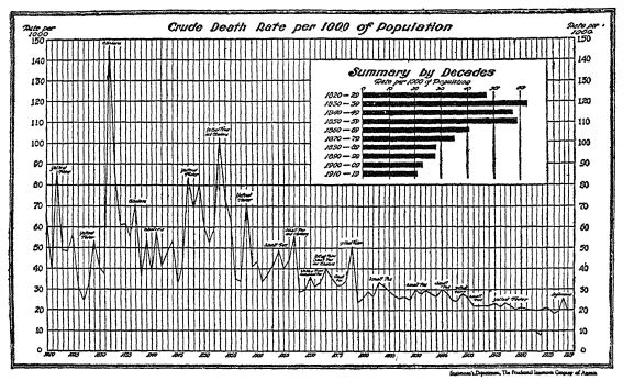 Diminishing illness and accidents. — We have already seen that, thanks to the growth of medical knowledge and of institutions which turn that knowledge into rules of action, we are making great gains in diminishing illness. The diagram on the opposite page, showing how the death rate has dechned in a hundred years in one of our cities, shows that progress is taking place. Similar progress has taken place in the last twenty-five years in our business houses where better medical attention and gi-eater emphasis upon “Safety First” are reducing illness and accidents.