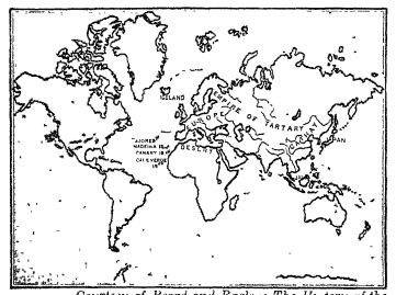 1. To begin with, people did not hnow much about the rest of the world or about goods from other places. The common man lived and died in his own little hamlet. He seldom saw goods from other lands. People from the nearest town were to him foreigners and almost enemies. Even the rulers, scholars, and traders knew little of the world as compared with what we know to-day. Above is a map showing the known parts of the world before Columbus made his famous voyage. How limited the people of that time would be in their knowledge of places where interesting goods could be secured ! W e must remember, too, that there were no public schools, few printing presses, no public mail systems, no newspapers — few of the information spreaders that are so common to-day. Trade with other lands would not be large under such conditions.