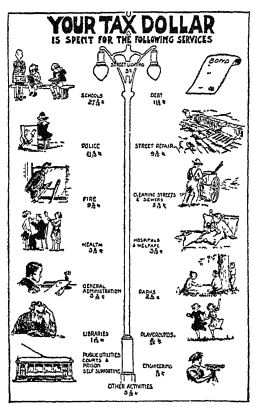 In government. — So also, money is a device for planning and measuring and organizing much of the work of our city, [ p. 294 ] state, and national governments. Our servants, the public officials, plan the things that should be done and what it will cost to do them. In this will be included costs of army, navy, education, maintaining parks, paying policemen and firemen, keeping up playgrounds — hundreds of things. They figure out what taxes should be laid and what they will yield. There are taxes on incomes, on real estate, on inheritance, on personal property, on corporations, as well as many kinds of fees and special assessments. The public officials think through all their plans and finally organize a budget of governmental income and expenditures just as did the family and the businesses discussed above.