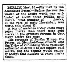 Sometimes nations get into unfortunate situations where they cease to pay gold for paper money as they have promised. They cease to redeem their paper money in gold. When this happens, they sometimes print enormous quantities of paper money, which then changes in value very rapidly. This happened, for example, in Russia and in Germany after the World War. Before the war, our dollar was worth four marks. October 1, 1923, it took 3.800.000.000 paper marks to equal one dollar. A month later it took 167.000.000.000. After another month it took 7,000,000,000,000. The results in Germany were very serious. Business became more like gambling than like ordinary business. No one felt safe in making plans with the value of the mark changing so rapidly.