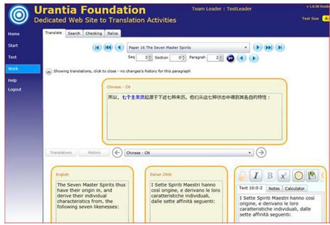 En 2009, durante la conferencia de la Asociación Urantia Internacional en Málaga, me reuní con Georges Michelson-Dupont, el responsable de traducciones de la Fundación. Vio la herramienta de la base de datos y quiso ampliarla para que todas las traducciones de El libro de Urantia pudieran usarla. Con esta nueva tecnología, tenemos un sistema en línea que nos permite tener el trabajo final de cada equipo de traducción o de revisión, el historial de todos los cambios hechos en cada párrafo y la capacidad de mostrar, en la misma pantalla, todas las revisiones previas hechas a cada párrafo específico. El libro de Urantia tiene más de 16.000 párrafos, y la media de revisiones es de cuatro cambios por párrafo. Esto son más o menos 70.000 registros de revisiones; una tarea de grabación pequeña para una base de datos informatizada, pero imposible para un ser humano.