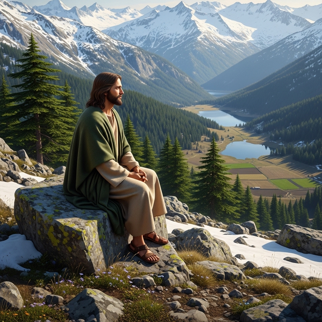Los días se fueron sucediendo deprisa. El miércoles Jesús descansó un poco y se dedicó a explorar el bosque, caminando por las laderas hasta una pequeña cumbre cercana. En los últimos taludes los árboles iban cediendo, y en las zonas de umbría aún se podían encontrar bloques de nieve intactos. Jesús tomó un trozo de nieve y frotó sus manos con él. El frío de la nieve y el hielo eran una experiencia poco frecuente para un galileo. Se sentó en lo alto del repecho y observó el inmenso paisaje que se extendía a sus pies desde allí. Detrás de él, hacia el oeste, se alzaban las más altas cumbres del Hermón. Muy abajo se podía apreciar el sinuoso sendero que subía hasta el campamento. Apenas se podía adivinar dónde se encontraba Quinea, y tampoco se distinguía Beit Jenn. Pero al fondo se apreciaba el fértil y frondoso valle atravesado por la carretera de Damasco, y hacia el sur, se conseguía divisar, aunque con dificultad, las aguas de varios lagos, probablemente el Hule. Durante su estancia en la montaña, repitió en varias ocasiones esta visita a la cumbre.