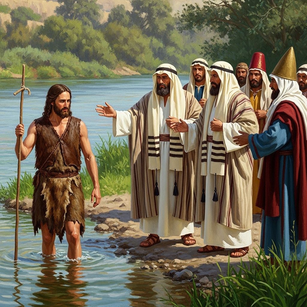 Tratando de averiguar de primera mano algo más sobre el asunto, el sanedrín aprobó el envío de una delegación. Cuando Juan les vio llegar, miró con gesto de hastío hacia otro lado y continuó con sus bautismos. Ninguno de los fariseos deseaba impurificarse en el contacto con el agua. Ellos consideraban que las abluciones de los bautismos debían realizarse en recintos purificados denominados miqvéhs, unas típicas bañeras que los judíos piadosos tenían en sus casas, así que permanecieron en pie junto a la orilla.[2]