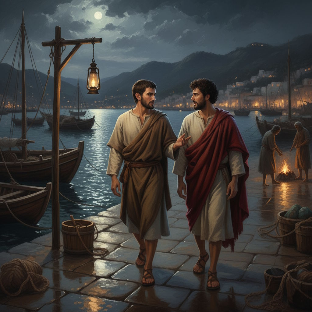 Esa noche, después de la cena, Felipe dejó a Natanael con Jebud y se fue a pasear por el puerto. Conversó con los pescadores de la aldea, interesándose por sus capturas, por las redes, y todo lo relacionado con su arte. Mientras charlaba casualmente con estos hombres, apareció Tomás, el epistates. Al principio, el joven se mantuvo distante, aunque con el oído puesto en las conversaciones. Pero después de unos minutos, se acercó a los corrillos.