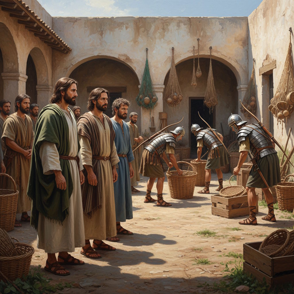 A los pocos días, Jesús se empezó a mostrar algo preocupado y serio. Desaparecía por la mañana y sólo regresaba a la hora del almuerzo. Una mañana, el Maestro reunió a los doce y les preguntó, para sorpresa de los apóstoles, por las armas que portaban. Muchos de los discípulos, como buena parte de la población judía, solían portar algún puñal o daga, o un buen bastón, para defenderse de posibles atacantes. Los bandidos y salteadores podían acechar en cualquier ciudad o camino.
