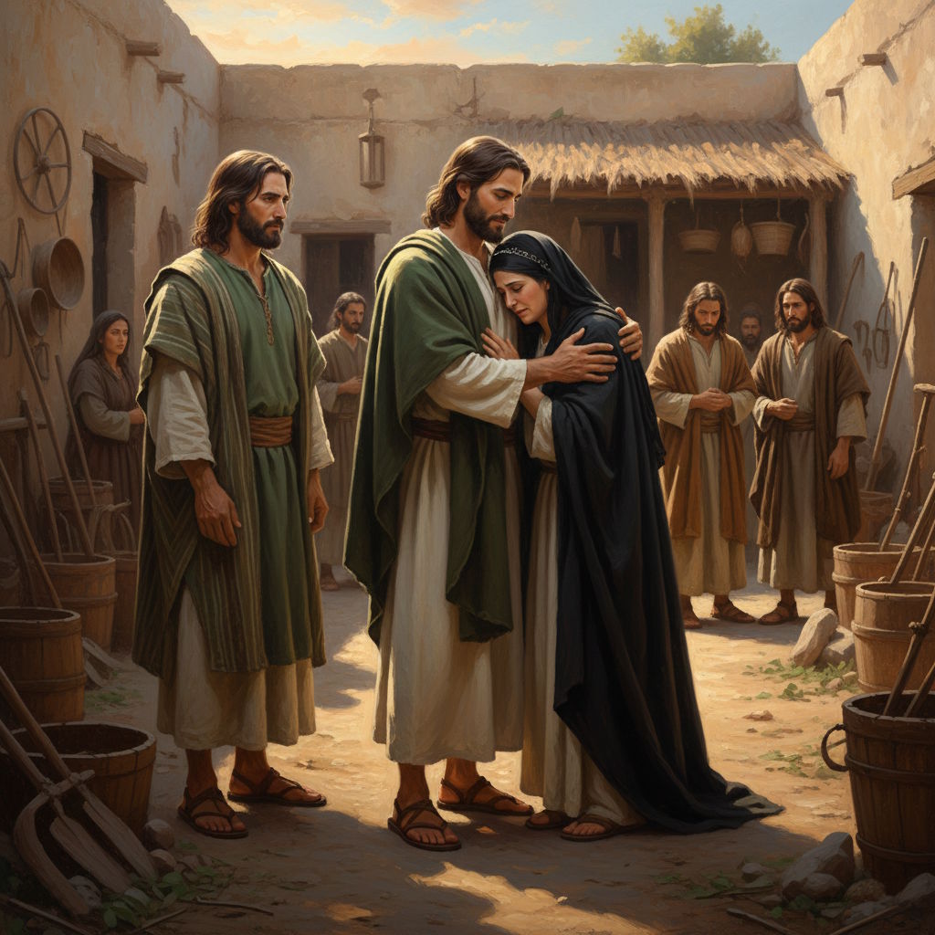 Fue la voz llena de dulzura de Jesús, sus entrañables ojos castaños, y esos modales lejos de los convencionalismos sociales hacia la mujer los que provocaron un repentino cambio de actitud en María, esta mujer de Jotapata. Y después de estas palabras del Maestro, no dudó en incorporarse, y dirigiendo la palabra al Rabí, la primera palabra que dijera a nadie en muchos días, terminó por romper a llorar desconsolada sobre el hombro de Jesús.