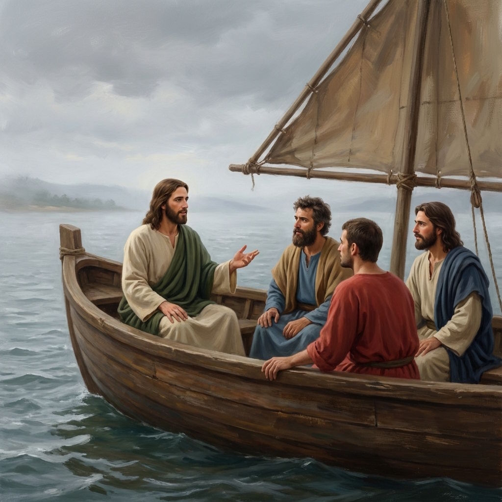 Así pues, mientras los doce retomaban su trabajo de predicación a los grupos de visitantes bajo la dirección de Andrés, Jesús se subió a una barca con Pedro y los hermanos Zebedeo y se adentraron en el lago, echando la piedra del ancla a cierta distancia de la costa.