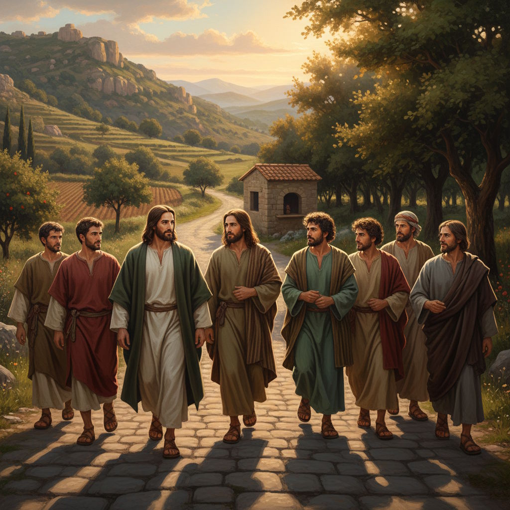 Jesús y los doce, que llevaban a cuestas, junto con el resto de su equipaje, una lona para montar una tienda, escogieron un lugar apropiado junto al camino y dedicaron el resto del día a organizarse. Recogieron leña de la zona para hacer un fuego y levantaron la tienda situando varias estacas en los extremos.