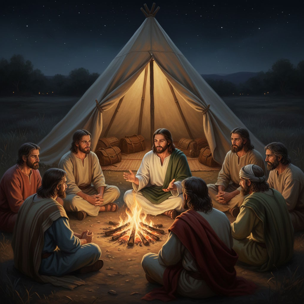 Habían terminado las sesiones vespertinas con los oyentes de la tarde, y los doce estaban ahora a solas en su tienda, cerca de la fogata que habían encendido afuera, y comiendo algo de pan, aceite y fruta. Solían dejar que la fruta se asara al fuego y luego la aplastaban contra una crujiente torta de pan horneado, formando un sabroso bocado para sus estómagos hambrientos.