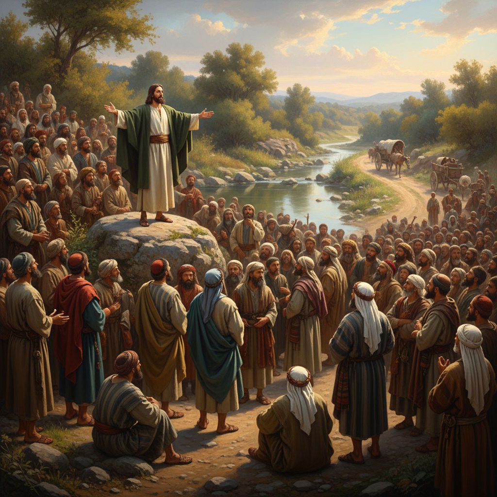 Una vez la numerosa caravana de seguidores de Jesús arribó a la población se despertó una curiosidad inusitada. La fama del Maestro empezaba a extenderse por toda la región. A la ingente tropa no le costó demasiado encontrar un lugar donde instalar sus tiendas. Existía una zona próxima al Jordán donde era costumbre hacer noche, un lugar espacioso y llano frente al gran río.