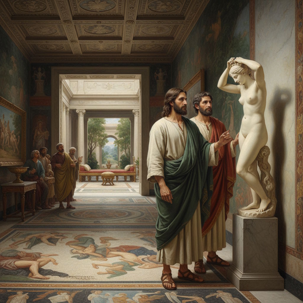 Los doce no sabían dónde mirar. La sugerente figura, mostrando dos tersos senos, y con la postura de una mujer que retoca su peinado, era el colmo de la indecencia para un judío piadoso. Esperaban poder salir de aquel antro helénico que rezumaba paganismo por los cuatro costados, pero el Rabí, para su fastidio, fue recorriendo con calma el peristilo, apreciando cada obra que exhibía Flavio.