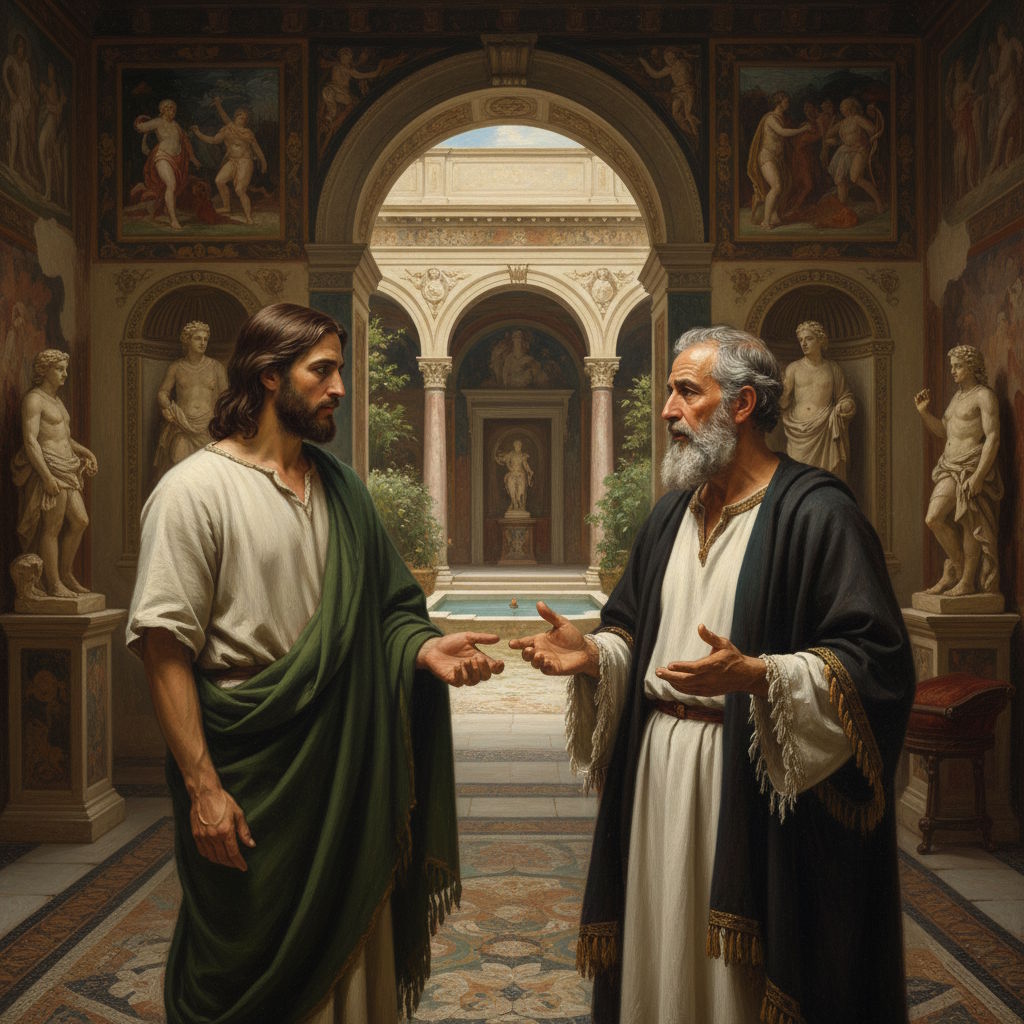 Nicodemo llegó a última hora de la tarde, escoltado por varios sirvientes, y evitando que le vieran entrar en la casa del griego. Le condujeron hasta el espacioso jardín trasero de la casa de Flavio, donde Jesús conversaba con Pedro, Santiago y Juan.