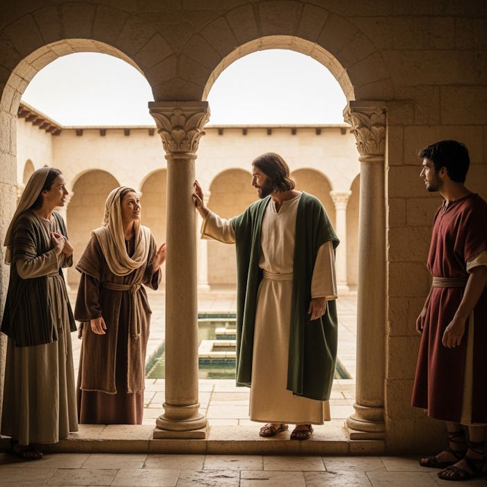 Llegaron a Betania el martes por la mañana. Se dirigieron de inmediato a la casa de Lázaro. En el exterior, aparentemente, daba la sensación de no haber nadie. La puerta del patio estaba cerrada y tenía la cancela echada. Jesús palmeó con fuerza en la puerta. Los golpes surtieron su efecto porque al rato unos rápidos pasos se oyeron llegar. Quien abrió era uno de los criados de la casa. El siervo reconoció al instante a Jesús, poniendo gesto de asombro, pero Jesús se llevó un dedo a los labios, indicándole silencio. Sigilosamente, Juan y Jesús atravesaron el patio y el peristilo de la casa. En una de las habitaciones que daban al estanque se oían dos voces conocidas. Jesús entró y se quedó parado en la puerta, haciendo sombra con su cuerpo. Dos mujeres se dieron la vuelta alarmadas y soltaron un grito de emoción: