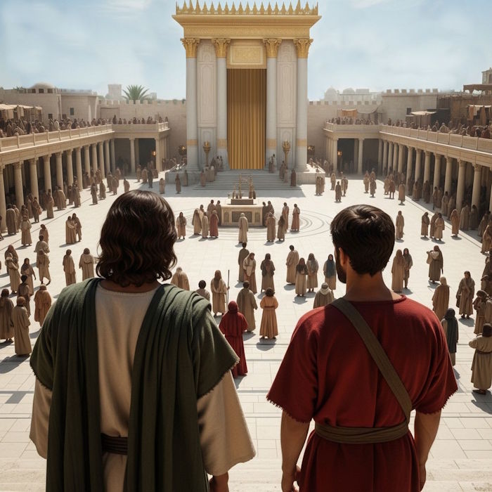 Se levantaron temprano y marcharon a Jerusalén pasando por el monte de los Olivos. Entraron por la puerta de la Fuente y subiendo por la calle Ancha en el Tyropeón, se acercaron al recinto del templo. Hacía mucho desde la última vez que Juan o Jesús habían paseado entre la alegre algarabía de los peregrinos que se congregaban en este edificio sagrado.
