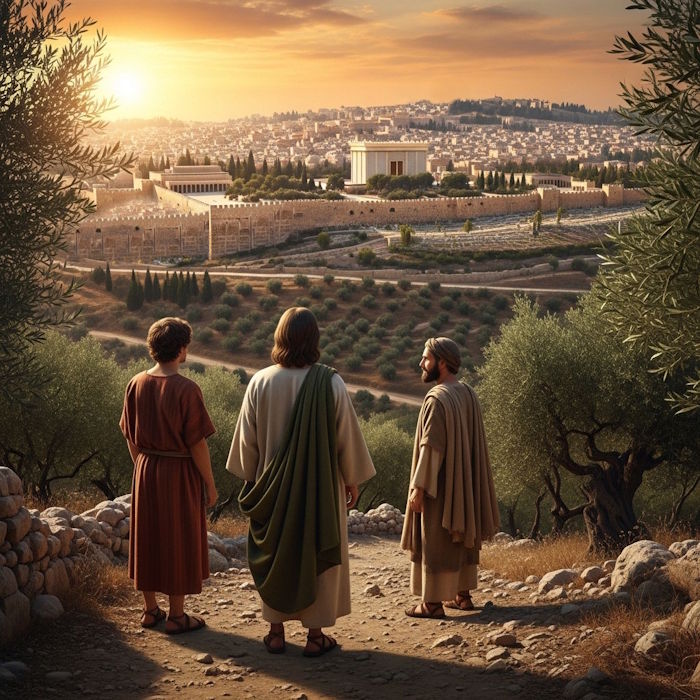 Regresaron sin ver terminar los ritos del día. Eran tres silenciosos amigos los que atravesaron el monte de los Olivos. Ninguno pronunció palabra. Desde lo alto pararon a contemplar el espectáculo sobrecogedor de Jerusalén al atardecer. Hasta allí llegaban los cantos del pueblo, que se alzaban desde el templo y subían hasta el cielo. El techo del santuario brillaba con un fuego áureo, y las piedras espejeaban luminosas con los últimos rayos del sol poniente. Las casas y mansiones parecían acurrucadas bajo el brazo inmenso y protector de los muros del monte santo.