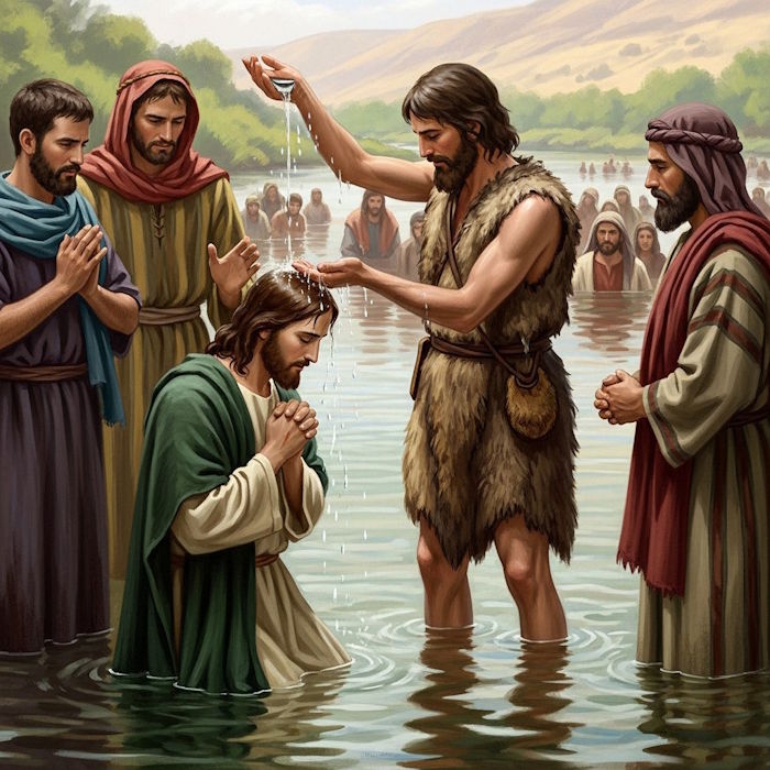 El Bautista, saliendo de su asombro, se dispuso de inmediato, tomando con las manos un chorro de agua. Jesús se inclinó hacia delante hincando su rodilla en el fondo del cauce. Juan vació sus manos sobre el cabello de Jesús. No sabía qué frase pronunciar. No se atrevía a decir la consabida letanía: «Arrepiéntete y purifícate», que pronunciaba para muchos de los creyentes. ¿Cómo hacer semejante mención ante quien consideraba «el anhelo de todas las edades», «el profeta más esperado»?