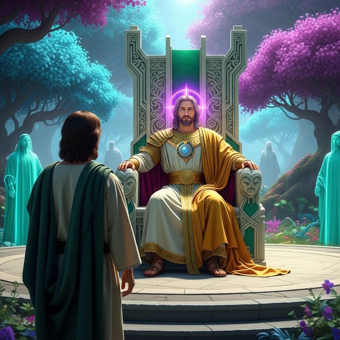 En el asiento Jesús se vio a sí mismo, sentado, mirándose. Pero su apariencia era muy distinta. Su rostro era más anciano, y su cabello era plateado con reflejos castaños. No tenía barba, pero en sus ojos y en sus rasgos se adivinaban las facciones del mismo Jesús. Vestía una sencilla toga blanca que le caía hasta los pies descalzos, y colgando en su pecho llevaba una cadena con un emblema de tres círculos azules sobre un pulcrísimo fondo blanco.[6]