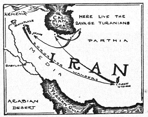 El escenario de nuestra historia se desplaza hacia el oeste, dejando atrás las ciudades amuralladas y los arrozales de China y ascendiendo hacia la agreste meseta de Irán, en el oeste de Asia. Los primeros hombres blancos de Irán, la región hoy llamada Persia, eran de ascendencia aria; y su religión era muy similar a la de los arios que invadieron la India y Grecia. Era un animismo centrado en la adoración de Ashura, Anahita, Mitra, Haoma y muchos otros espíritus que supuestamente habitaban en los objetos naturales. Nadie sabe exactamente cómo ni dónde se originó ese animismo; porque nadie sabe de dónde vinieron los arios. Tampoco sabemos exactamente cuándo terminó ese animismo, pues no existen registros auténticos de la historia de Irán antes del siglo VII a. C. Todo lo que se sabe es que surgió un animismo primitivo, floreció y luego desapareció, y que un hombre llamado Zaratustra, o más popularmente, Zoroastro, fue responsable de su desaparición.
