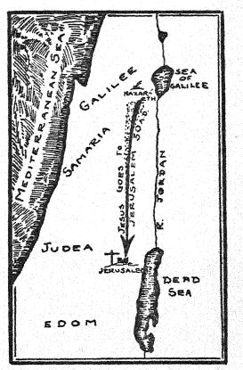 Pero solo era famoso en Galilea, y Galilea era simplemente una zona remota y sin importancia del país. Es probable que en Jerusalén, la capital, ni siquiera se supiera el más mínimo rumor de su aparición. Así que llegó por fin el día en que Jesús decidió salir de Galilea y llevar su evangelio al resto de su pueblo. Decidió ir incluso hasta Jerusalén e intentar predicar su palabra en la misma fortaleza de los sacerdotes y rabinos. El momento elegido fue justo antes de la Pascua, pues Jesús sabía que la capital estaría entonces repleta de judíos venidos de todos los rincones del país para celebrar la fiesta en el Templo. Así, con sus doce seguidores principales, sus discípulos, [ p. 269 ] y un pequeño grupo de mujeres devotas, partió valientemente hacia el sur. …