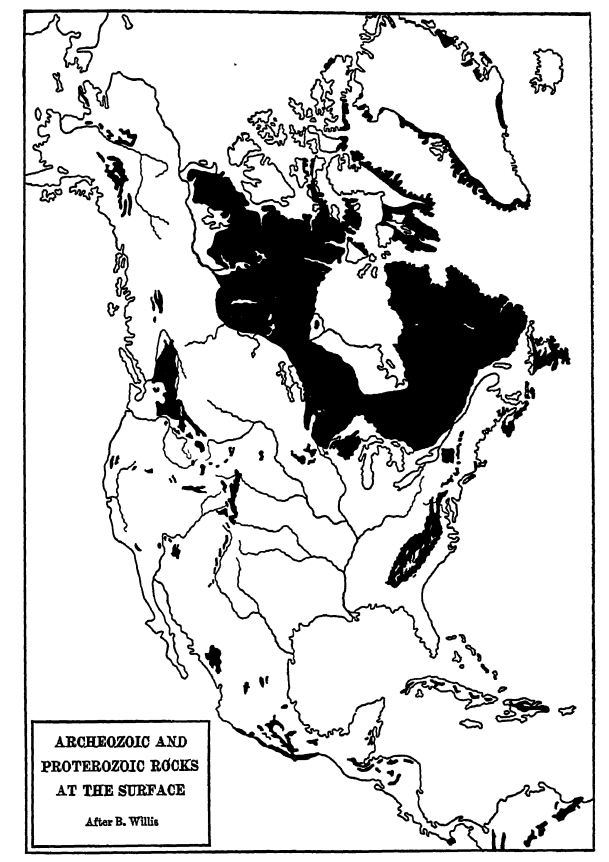 Formations archéozoïques. — Les formations de Keewatin et de Coutchiching sont les plus anciennes formations connues d’Amérique du Nord. La formation de Coutchiching est la plus ancienne série de sédiments connue et se rencontre généralement dans la région des lacs Rainy, au nord du Minnesota, au Canada. Son épaisseur est d’au moins 1 400 mètres (4 600 pieds). Elle était initialement composée principalement de schistes carbonés, aujourd’hui métamorphisés en micaschistes et en dolomie, tous deux probablement d’origine marine. La formation de Keewatin, surtout connue dans la région du lac des Bois, à l’extrême ouest de l’Ontario, est constituée de coulées de lave sombres subaquatiques (généralement des basaltes, aujourd’hui des roches vertes ou des schistes), avec quelques lits de cendres et des mudstones noirs carbonés et sableux, aujourd’hui transformés en schistes. Plus à l’est, comme à Hunter’s Island et le long de la rivière Mattawin, on trouve d’importantes quantités de fer (généralement de l’hématite) dans des jaspes rubanés. Ce fer est exploité dans la chaîne Vermilion, au Minnesota. La formation de Keewatin, tout comme celle de Grenville qui lui succède, est largement répandue, mais ses affleurements sont généralement petits et très localisés. Elle représente l’une des plus importantes coulées de basalte.