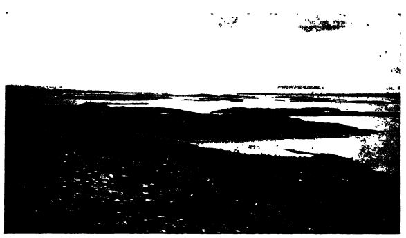 Caractéristique actuelle du Bouclier canadien. — La majeure partie de la surface actuelle du Bouclier canadien (voir carte, p. 139) est une plaine ondulée parsemée d’un réseau complexe de lacs et de rivières interconnectés (fig. ci-dessous). Près de son centre se trouve une dépression abritant la baie d’Hudson, une mer épicontinentale d’une profondeur moyenne de 128 mètres (420 pieds). De ce bassin central, la plaine s’élève dans toutes les directions vers le plateau continental. Le niveau général de la plaine au-dessus de la mer est d’environ 457 mètres (1 500 pieds), et les dénivellations locales sont généralement inférieures à 46 mètres (150 pieds), bien que, rarement, elles puissent atteindre 152 mètres (500 pieds) au-dessus du niveau général de la plaine.