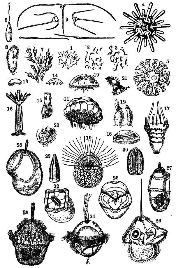 Le développement des métazoaires vivants est d’une rapidité variable : de la cellule fécondée à un petit groupe de cellules formant un minuscule embryon sphérique et creux appelé blastula (qui signifie petit germe, bourgeon ou embryon), ces agrégats, qui ne se développent pas davantage, sont encore vivants aujourd’hui (par exemple, Volvox, un protozoaire colonial ; il s’agit cependant de colonies plus importantes, composées de milliers de cellules). Les blastulas les plus simples ne présentent aucune différenciation cellulaire, et les invertébrés aquatiques à ce stade de développement sont généralement uniformément ciliés et se déplacent librement dans l’eau par un mouvement de rotation autour d’un axe défini, dont une extrémité est toujours orientée dans le sens du mouvement.