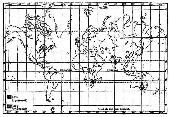 Autres tillites protérozoïques. — Des tillites d’âge protérozoïque, avérées ou probables, sont aujourd’hui connues dans de nombreux pays : notamment en Norvège, en Chine, en Inde et en Australie, et probablement en Afrique. Elles sont d’âges variés, certaines datant de la fin du Protérozoïque et d’autres plus anciennes (voir Fig., p. 172).