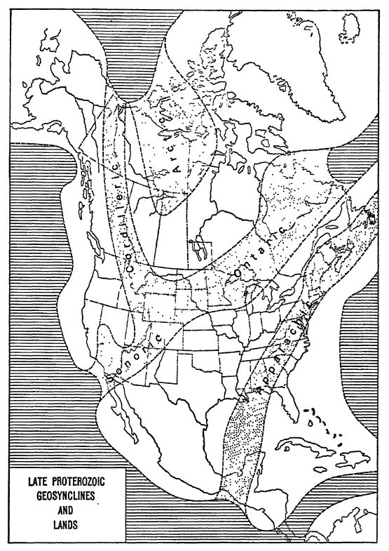 Géosynclinaux du Protérozoïque. — Schuchert a récemment cartographié la plupart des dépôts connus de la fin du Protérozoïque, et ses travaux ont ensuite été confirmés par les plus grands géologues spécialistes de ces formations. Le résultat est présenté sur la carte p. 159. On y constate qu’il existait au Protérozoïque quatre mers : (1) l’Appalachienne, (2) la Cordillère, (3) l’Ontario et (4) l’Arctique. Les formations du géosynclinal des Appalaches ne sont pas abordées dans ce chapitre, car elles sont trop altérées pour que leur nature originelle puisse être déterminée avec certitude. Les dépôts du géosynclinal de l’Ontario sont décrits plus en détail, car ce sont les strates les mieux connues du Protérozoïque, tandis que ceux de la mer Arctique sont mentionnés dans la section consacrée à l’Animikien. Les dépôts du géosynclinal cordillérain sont également abordés plus loin. Parmi ces voies maritimes, seul le géosynclinal de l’Ontario est connu pour avoir été oblitéré par l’orogenèse vers la fin du Protérozoïque. Cette dépression est un prolongement du géosynclinal de Québec décrit précédemment (voir p. 149).