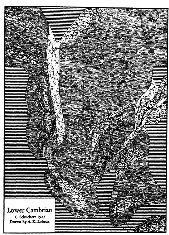Enfin, il convient de souligner un fait topographique frappant : lorsque les mers du Cambrien inférieur pénétrèrent dans la dépression des Appalaches par le sud, leurs vagues se brisèrent à l’est contre une chaîne de montagnes aussi imposante que les Alpes actuelles. Cependant, comme toutes les montagnes, leur splendeur fut éphémère à l’échelle géologique, et à la fin du Cambrien inférieur, elles furent réduites à des plaines (voir carte, p. 193).