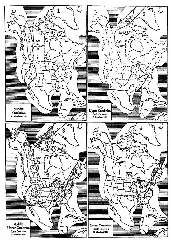 À la fin du Cambrien moyen, les eaux marines cordillères commencèrent pour la première fois à se répandre sur le continent vers l’est, et pendant la majeure partie du Cambrien supérieur, les mers épicontinentales furent très étendues, notamment dans la région du bassin du Mississippi. Dans les monts Arbuckle, en Oklahoma, on trouve pas moins de 900 mètres de calcaires et de dolomies. La dépression des Appalaches fut également réoccupée par ces eaux d’origine pacifique, qui y déposèrent des calcaires magnésiens mêlés de schiste. En Alabama, l’épaisseur est d’environ 1200 mètres, et cette profondeur reste relativement constante jusqu’à Chambersburg et Mercersburg, en Pennsylvanie, au nord. À son apogée, cette mer subsistait sur plus de 30 % de l’Amérique du Nord (Pl., p. 195, Fig. 2).