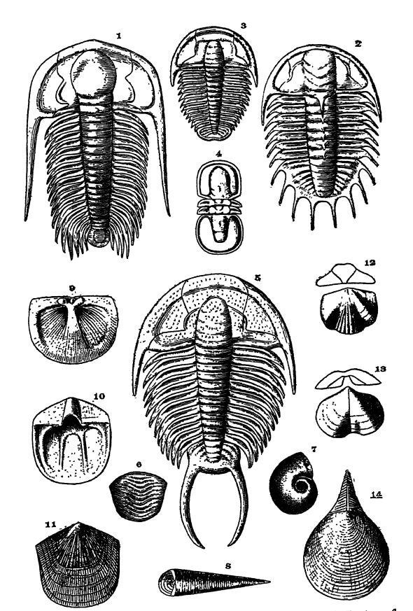 Les trilobites étaient, comme mentionné précédemment, les animaux les plus caractéristiques du Cambrien inférieur. Presque tous les nombreux brachiopodes possédaient des coquilles phosphatées ou calcaires, tandis que celles du Cambrien supérieur et des périodes suivantes étaient carbonatées ou calcaires. Les gastéropodes en forme de patelle (coquilles semblables à celles des escargots, des foreurs et des bigorneaux) étaient rares et du type le plus primitif ; à une exception près, ils étaient en forme de capuchon et non enroulés en spirale comme c’est généralement le cas chez ces animaux (Pl., p. 189, Fig. 10-12). Les tubes coniques à trois côtés connus sous le nom d’Hyolithes étaient abondants (Pl., p. 201, Fig. 8). Ils sont apparentés aux gastéropodes. On trouvait encore d’autres types d’animaux, mais pas de coquilles de moules, et seulement les céphalopodes les plus petits et les plus primitifs (Salterella et Volborthella).