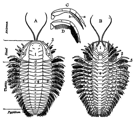 Chez Neolenus, deux cercopodes s’étendent à partir du pygidium et servaient probablement d’organes sensoriels, à l’instar des antennes (Fig. B, ci-dessus). Ces cercopodes pourraient avoir leur origine dans les pattes rampantes. Bien que les cercopodes ne soient connus que dans [ p. 212 ] de ce genre, il est fort probable que d’autres trilobites à petite queue en possédaient, mais qu’ils aient disparu chez les formes à grande queue lorsque le pygidium est devenu un organe natatoire.